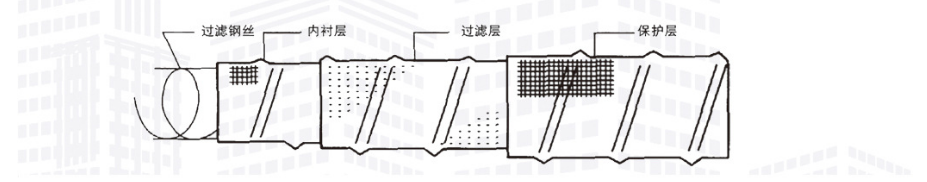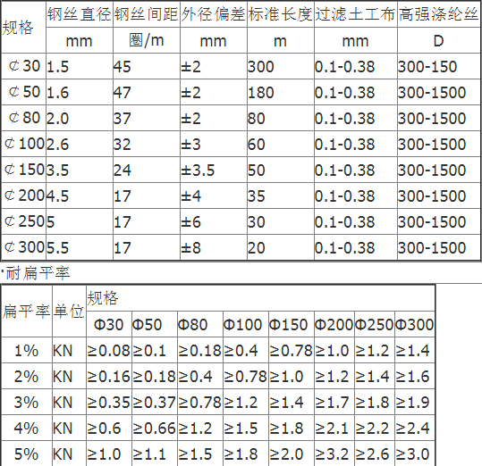 透水管是以防銹彈簧圈支撐管體,形成高抗壓軟式結構,無紡布內襯過濾,使泥砂雜質不能進入管內,從而達到凈滲水的功能。滌綸絲外繞祉覆層具有優(yōu)良吸水性,能迅速收集土體中多余水份。橡膠筋使管壁被覆層與彈簧鋼圈管體成為有機一體,具有很好的全方位透水功能,滲透水順利滲入管內,而泥砂雜質被阻擋在管外,從而達到透水、過濾、排水之目的。